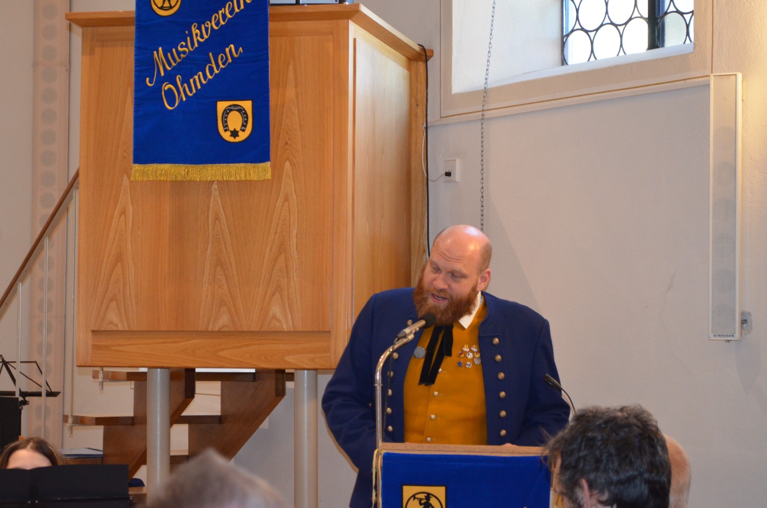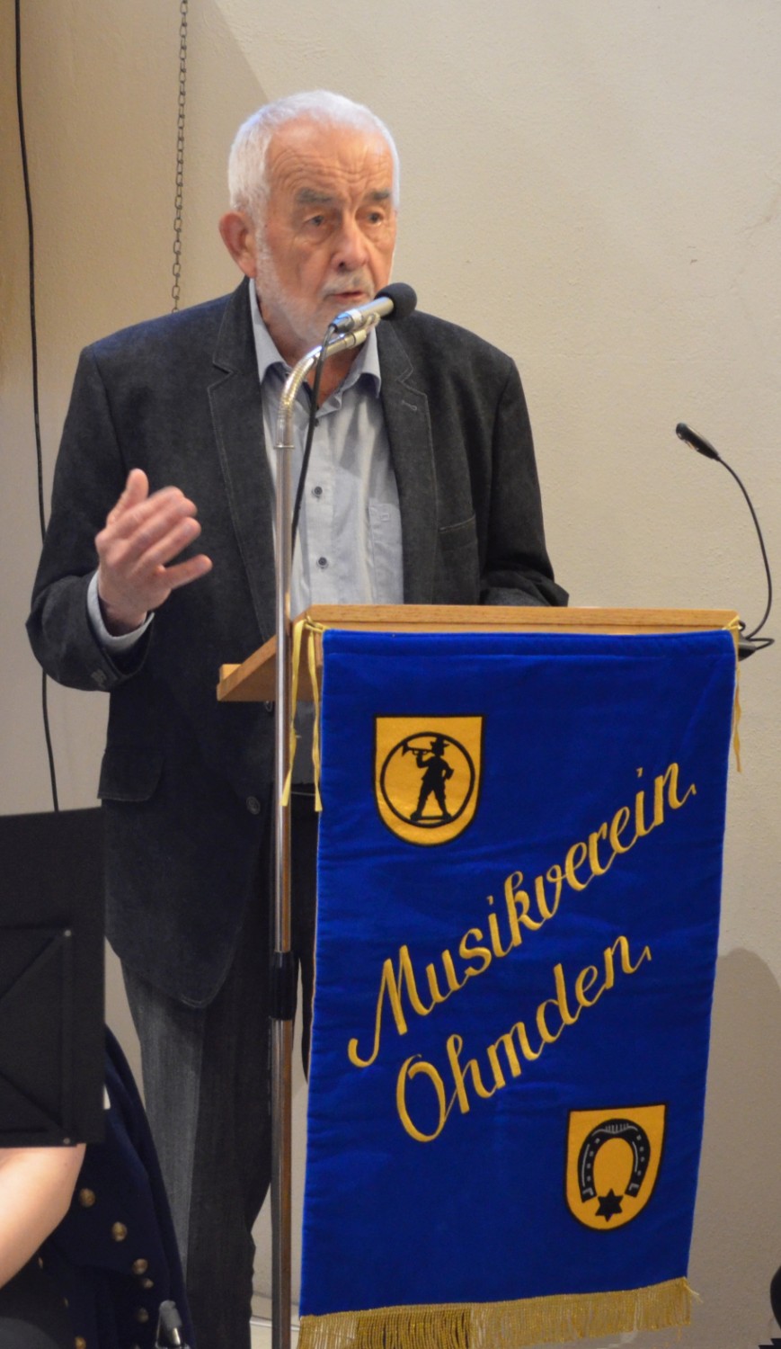 Nach der Jugendkapelle übernahm die Stammkapelle das Programm. Begleitet wurden die Musikerinnen und Musiker von Otto Spielvogel, der mit interessanten und unterhaltsamen Beiträgen zwischen den Musikstücken durch die 100-jährige Vereinsgeschichte führte und das Publikum mit auf eine musikalische Zeitreise nahm.