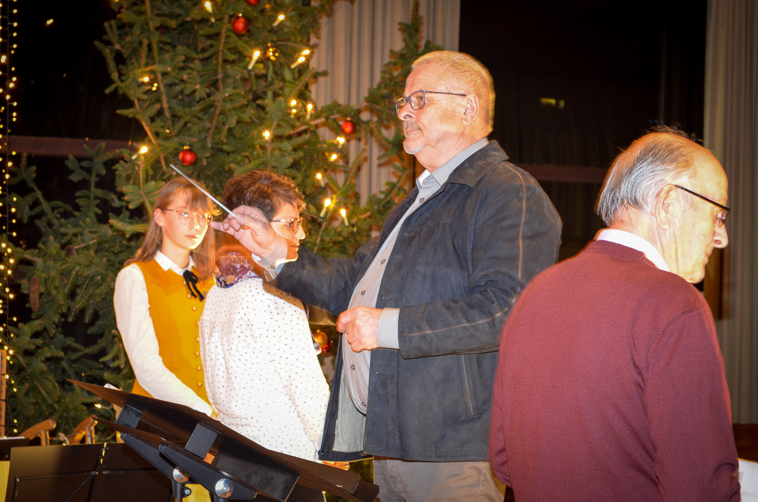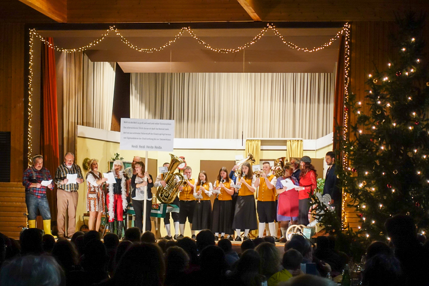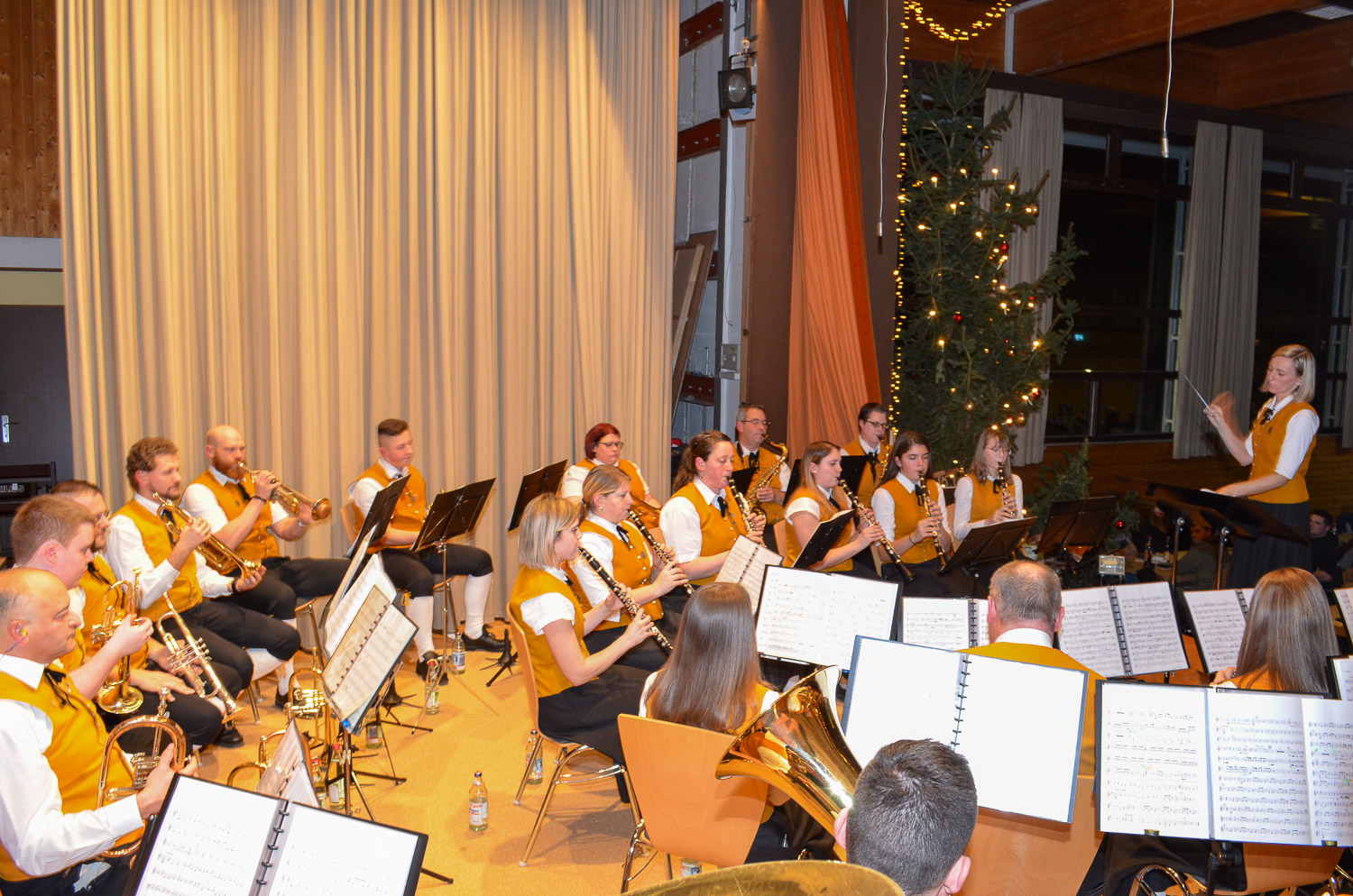 Nach einer kurzen Pause öffnete sich der Vorhang für die Stammkapelle unter der Leitung von Tanja Bergann. Mit dem Stück „Alpine Inspirations“ reisten wir zurück in das Jahr 1969, in welchem die Partnerschaft gegründet wurde. Es folgten Musikstücke, die Erinnerungen an die gemeinsame Freundschaft weckten und bereits viele Jahre zuvor bei Besuchen in Südtriol aufgeführt wurden. Mit Musikwerken wie „Fly me to the Moon“, „Der Klarinettenmuckel“ oder „My Dream“ durften sich zahlreiche Solisten dem Publikum präsentieren. Traditionell wurde der musikalische Teil des Abends stimmungsvoll mit Weihnachtsliedern beendet.
