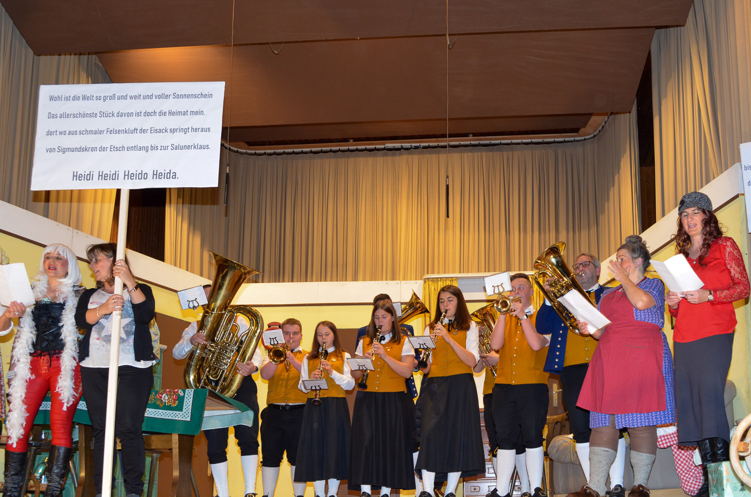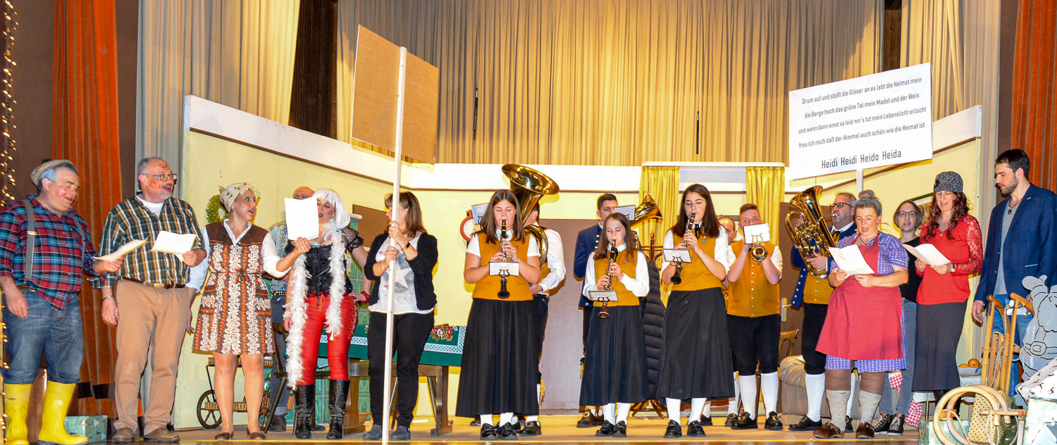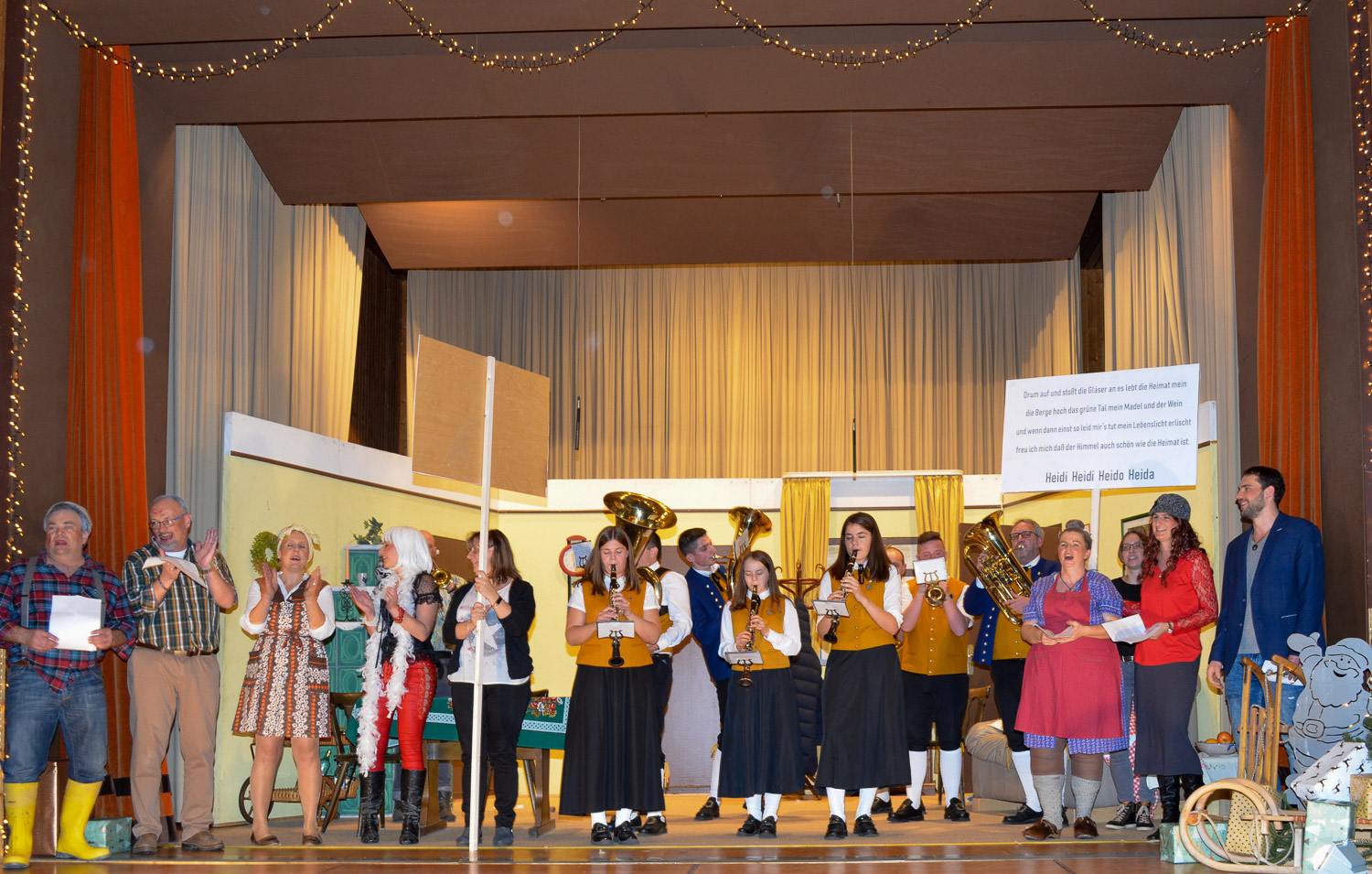 Nach einer kurzen Pause öffnete sich der Vorhang für die Stammkapelle unter der Leitung von Tanja Bergann. Mit dem Stück „Alpine Inspirations“ reisten wir zurück in das Jahr 1969, in welchem die Partnerschaft gegründet wurde. Es folgten Musikstücke, die Erinnerungen an die gemeinsame Freundschaft weckten und bereits viele Jahre zuvor bei Besuchen in Südtriol aufgeführt wurden. Mit Musikwerken wie „Fly me to the Moon“, „Der Klarinettenmuckel“ oder „My Dream“ durften sich zahlreiche Solisten dem Publikum präsentieren. Traditionell wurde der musikalische Teil des Abends stimmungsvoll mit Weihnachtsliedern beendet.