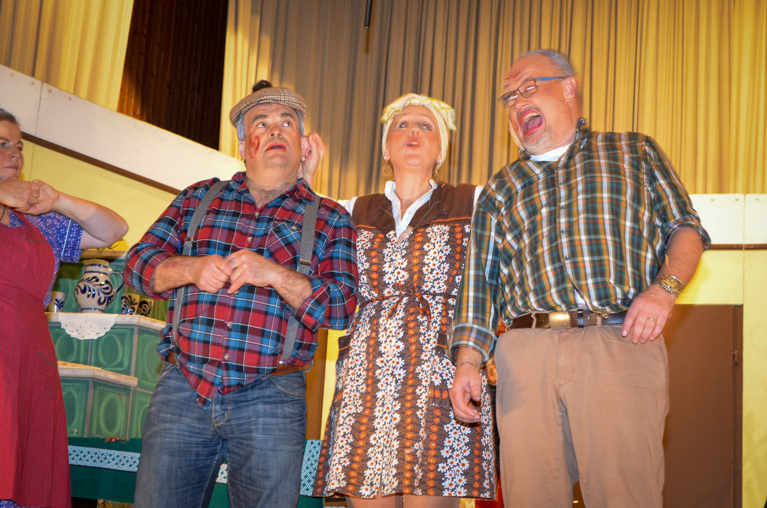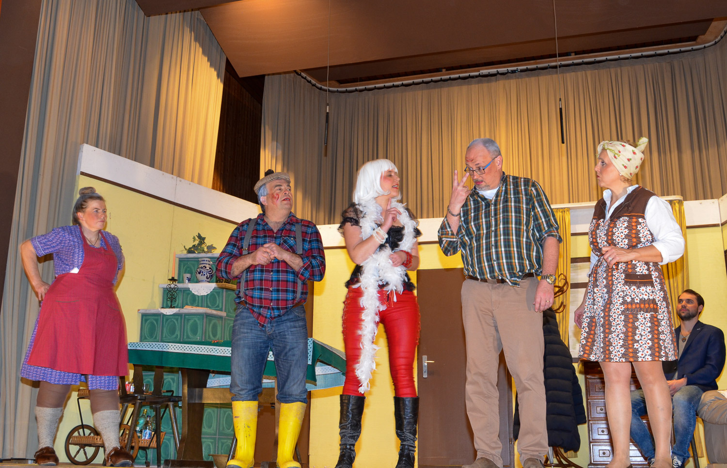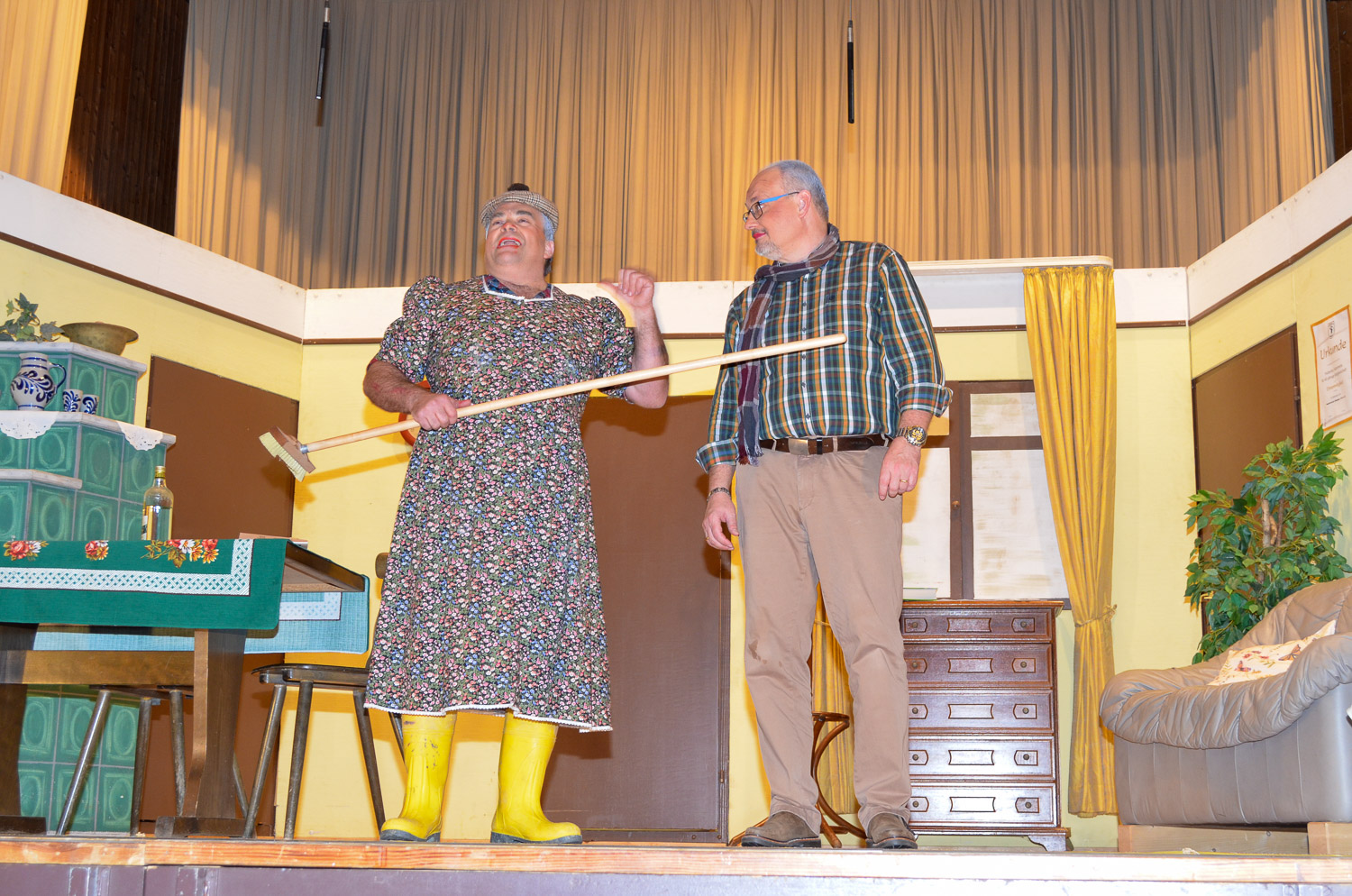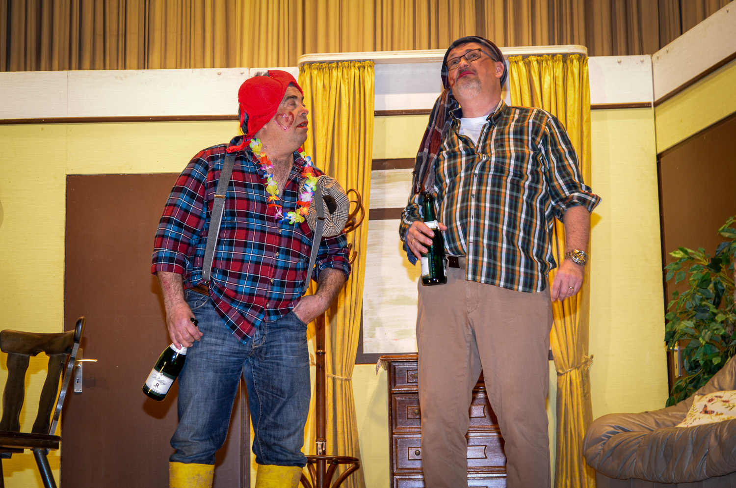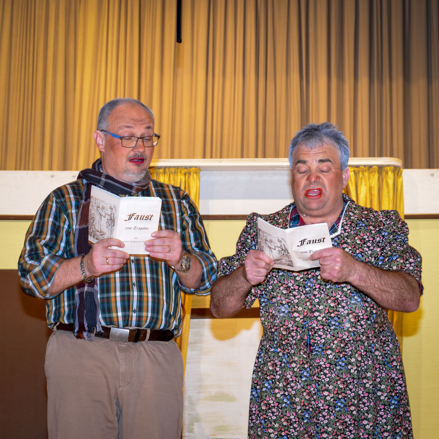 Nach dem weihnachtlichen Ausklang der Stammkapelle folgte eine 30 minütige Umbaupause. Während dieser Pause erfolgte die Sonderverlosung von Südtiroler Spezialitäten. Es konnten außerdem Lose für die prall gefüllte Weihnachtstombola erworben werden. Anschließend wurde das Ohmdener Volkstheater unter der Regie von Robert Pfnür, mit der schwäbischen Komödie „Jubiläumstheater nach Hubertus Art“ durch viel Beifall vom Publikum begrüßt. Auch die Komödie handelte vom 50 jährigen Partnerschaftsjubiläum des Musikvereins. so möchte Hubertus Hämmerle an der Jubiläumsfeier das kulturelle Highlight „Goethe´s Faust in Ohmden aufführen. Hierfür fährt er mit seinem Freund Friedolin nach Stuttgart, um sich im Theaterhaus von den Profis inspirieren zu lassen. Doch anstatt im großen Haus landen die beiden in der „Weißen Maus“ und lassen dort die Korken knallen. Nach manchen Verwicklungen hält das Stück doch noch ein gutes Ende für alle bereit. Dabei wurden auch die Lachmuskeln der Zuschauer kräftig strapaziert.