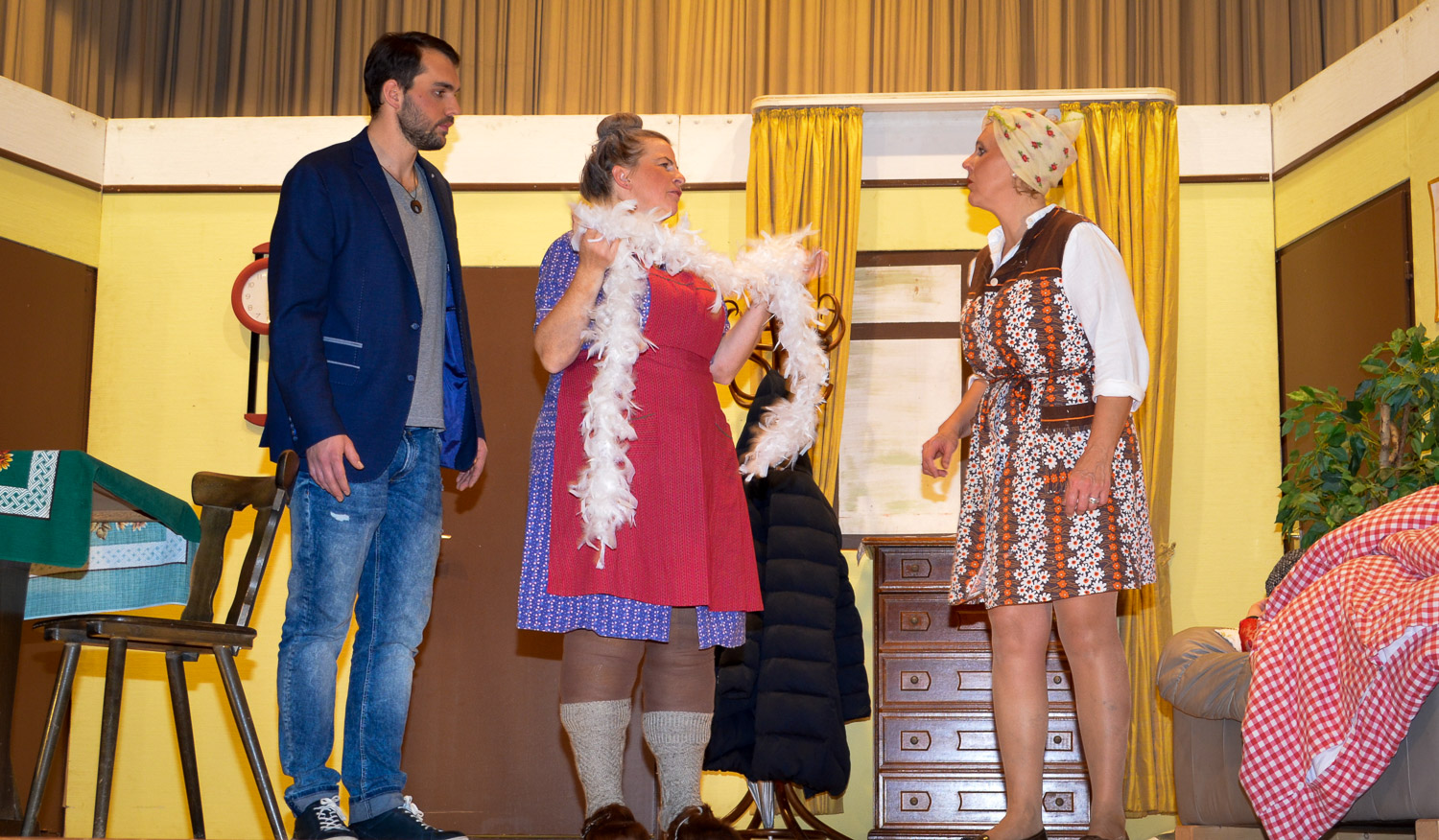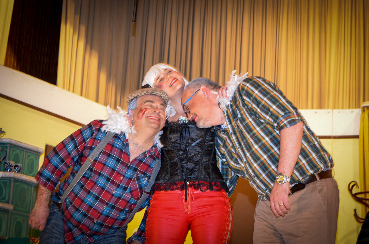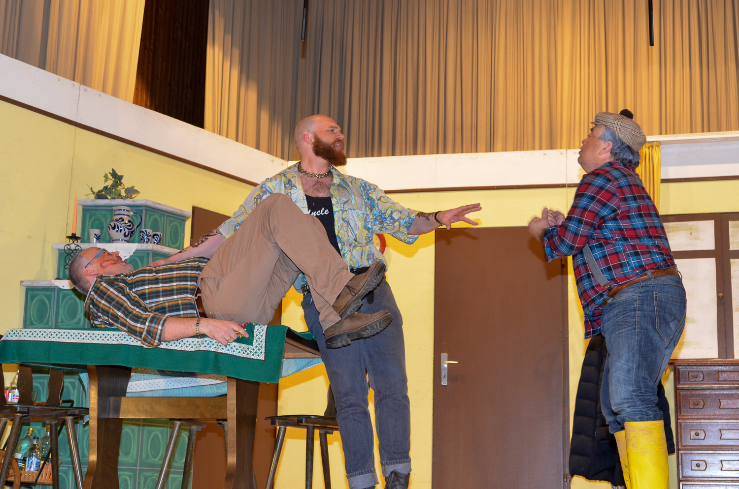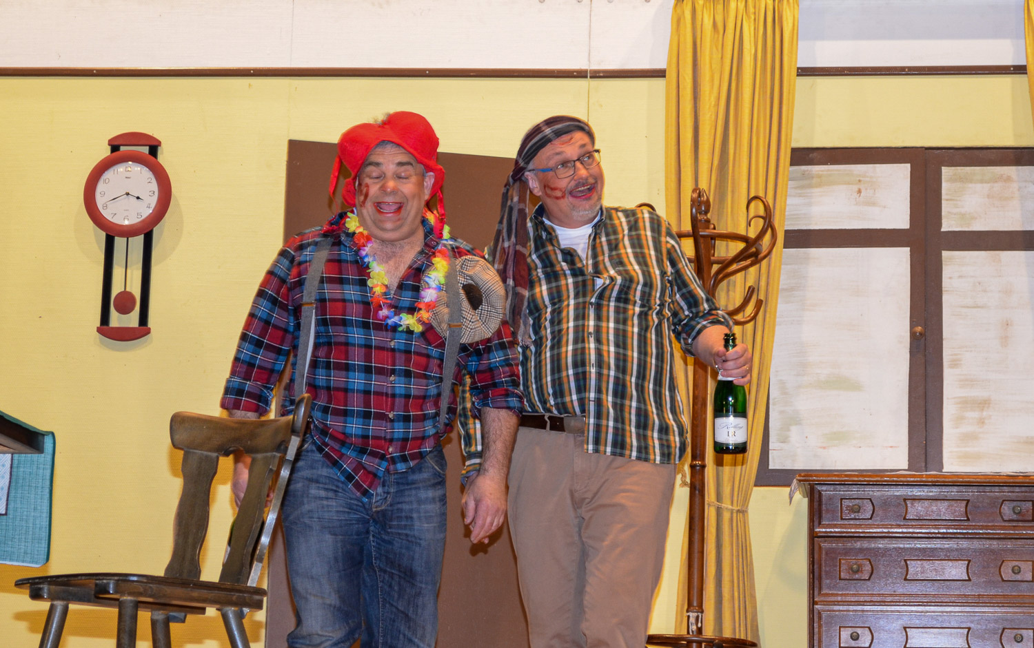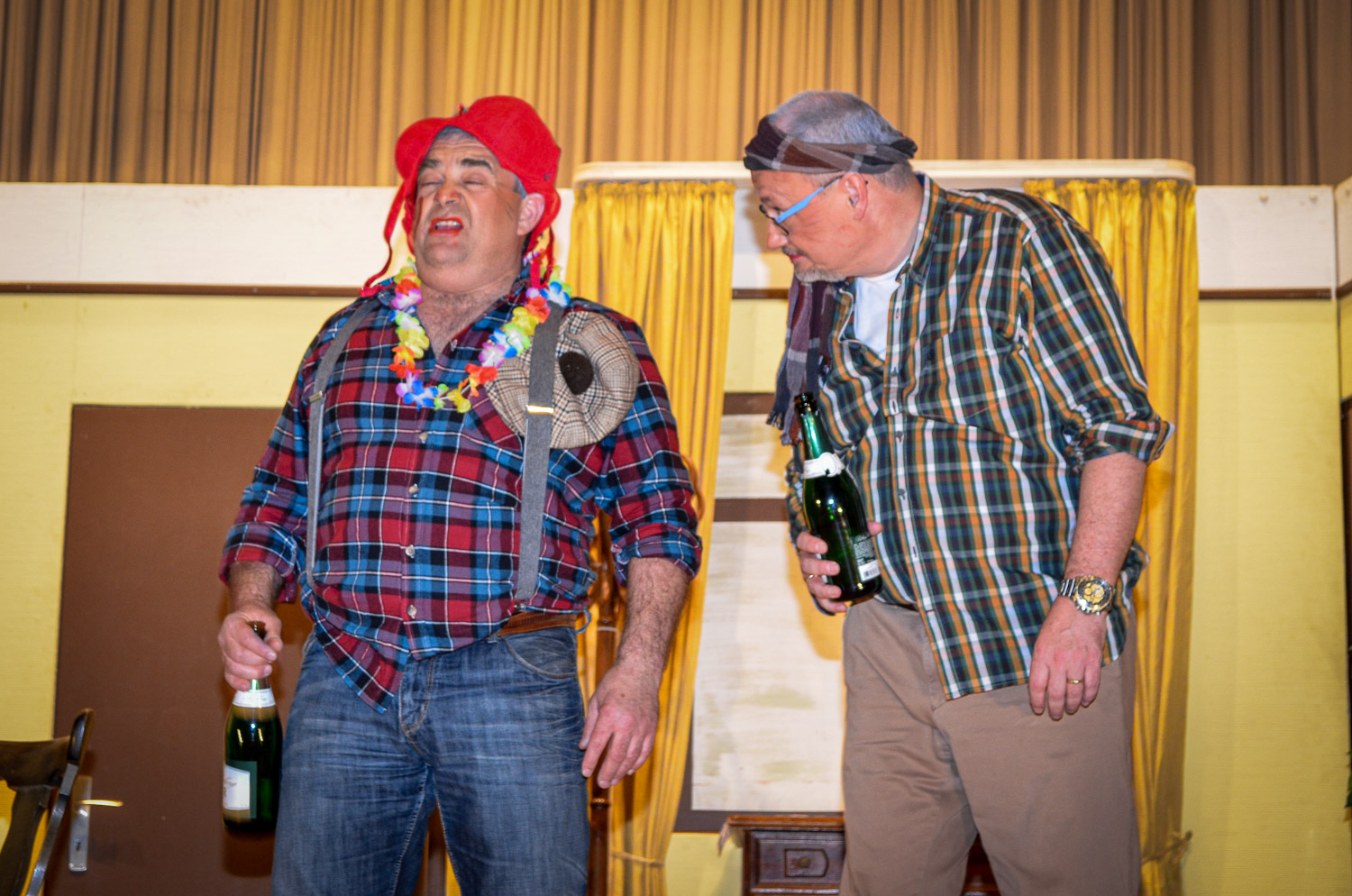 Nach dem weihnachtlichen Ausklang der Stammkapelle folgte eine 30 minütige Umbaupause. Während dieser Pause erfolgte die Sonderverlosung von Südtiroler Spezialitäten. Es konnten außerdem Lose für die prall gefüllte Weihnachtstombola erworben werden. Anschließend wurde das Ohmdener Volkstheater unter der Regie von Robert Pfnür, mit der schwäbischen Komödie „Jubiläumstheater nach Hubertus Art“ durch viel Beifall vom Publikum begrüßt. Auch die Komödie handelte vom 50 jährigen Partnerschaftsjubiläum des Musikvereins. so möchte Hubertus Hämmerle an der Jubiläumsfeier das kulturelle Highlight „Goethe´s Faust in Ohmden aufführen. Hierfür fährt er mit seinem Freund Friedolin nach Stuttgart, um sich im Theaterhaus von den Profis inspirieren zu lassen. Doch anstatt im großen Haus landen die beiden in der „Weißen Maus“ und lassen dort die Korken knallen. Nach manchen Verwicklungen hält das Stück doch noch ein gutes Ende für alle bereit. Dabei wurden auch die Lachmuskeln der Zuschauer kräftig strapaziert.