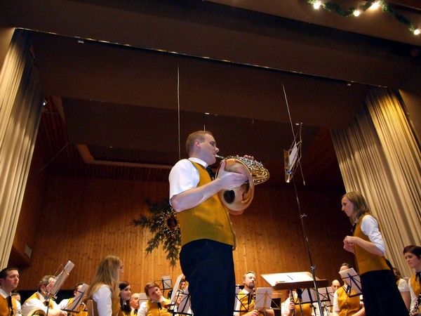 Solist Florian Riecker zeigte beim Stück „Alphorn-Zauber“, welchen wunderschönen Klang ein Waldhorn hat. Der Applaus war groß und so wurde ein Teil des Solos noch einmal als Zugabe gespielt.