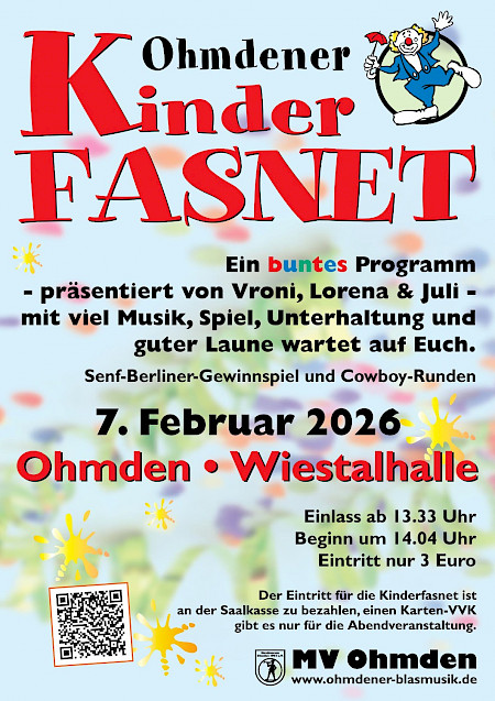 Neben der Abendveranstaltung findet am Nachmittag des 07. Februar wieder der kultige Kinderfasching in Ohmden statt. Die Jugend des Musikvereins wird in der närrisch geschmückten Gemeindehalle für gute Stimmung sorgen und hat sich ein tolles Programm mit vielen Spielen für ihre kleinen Gäste ausgedacht. Einlass ist wie jedes Jahr um 13.33 Uhr. Die Veranstaltung beginnt um 14:04 Uhr.