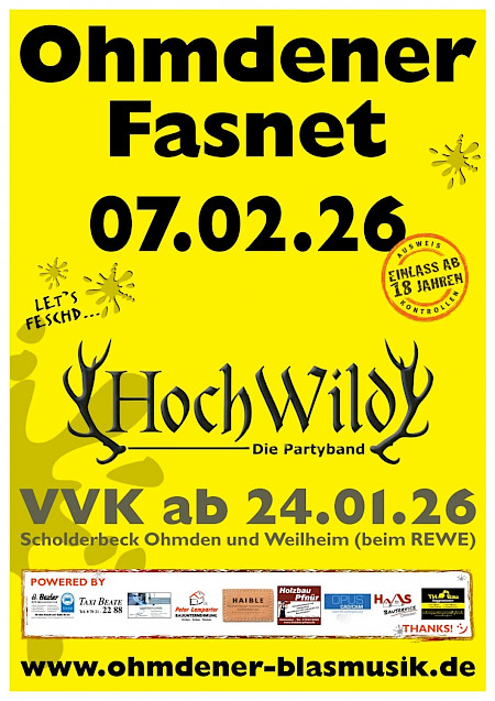 Am 07.Februar 2026 ist es endlich wieder so weit und wir dürfen euch zur diesjährigen Ohmdener Fasnet bei uns willkommen heißen. Am Samstag, den 24.01.2026 startet der reguläre Kartenvorverkauf in den Scholderbeckfilialen in Ohmden und Weilheim (im REWE). Die Eintrittskarte kostet 13€, Eintritt ist ab 18 Jahren.